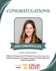 Mitchell, Simopoulos & Fattoum is pleased to announce that Jodi Simopoulos has been named to the 26th edition of Virginia Legal Elite. This distinction highlights her exceptional legal ability, professionalism, and the respect she has earned from fellow attorneys throughout the Commonwealth of Virginia.